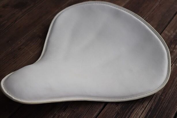 スポンジ整形、縫い、全て手作業でしています。薄型でどんな車両にも合わせやすいと思います。牛革より高価で希少な馬革のホワイトで製作しました。krシートでホワイトはありそうで無いので人とはかぶらないと思います。昔の革物には馬革が多く使われています。そちらを参考に製作してみました。自分色に汚れてきたらよりヴィンテージ感が出ると思います。