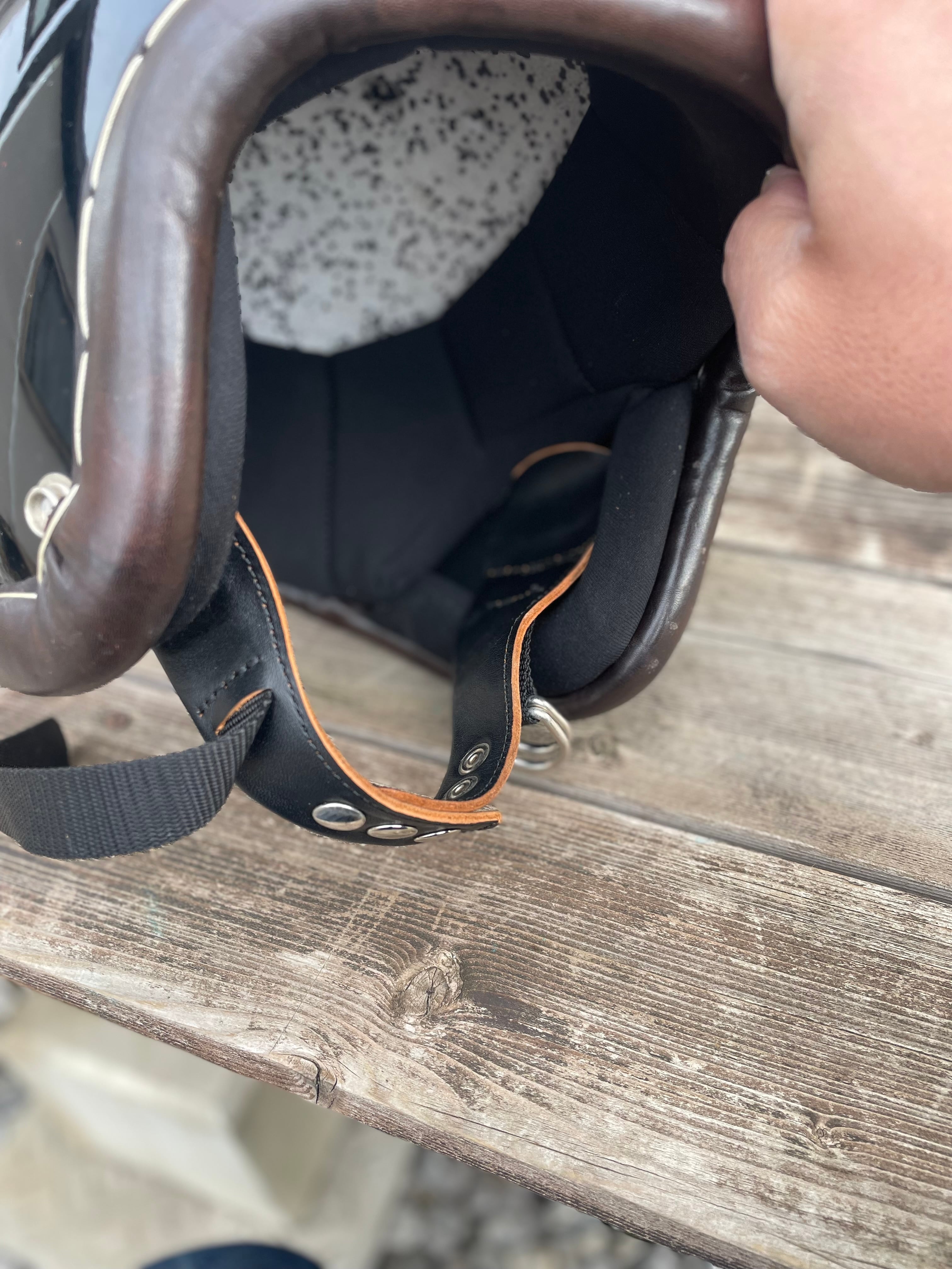 ヴィンテージ ヘルメットに相性よいです。ヴィンテージ 物は合皮で切れたりしてしまいますので本革のものにリペアするといいと思います。カスタムにも最適です。